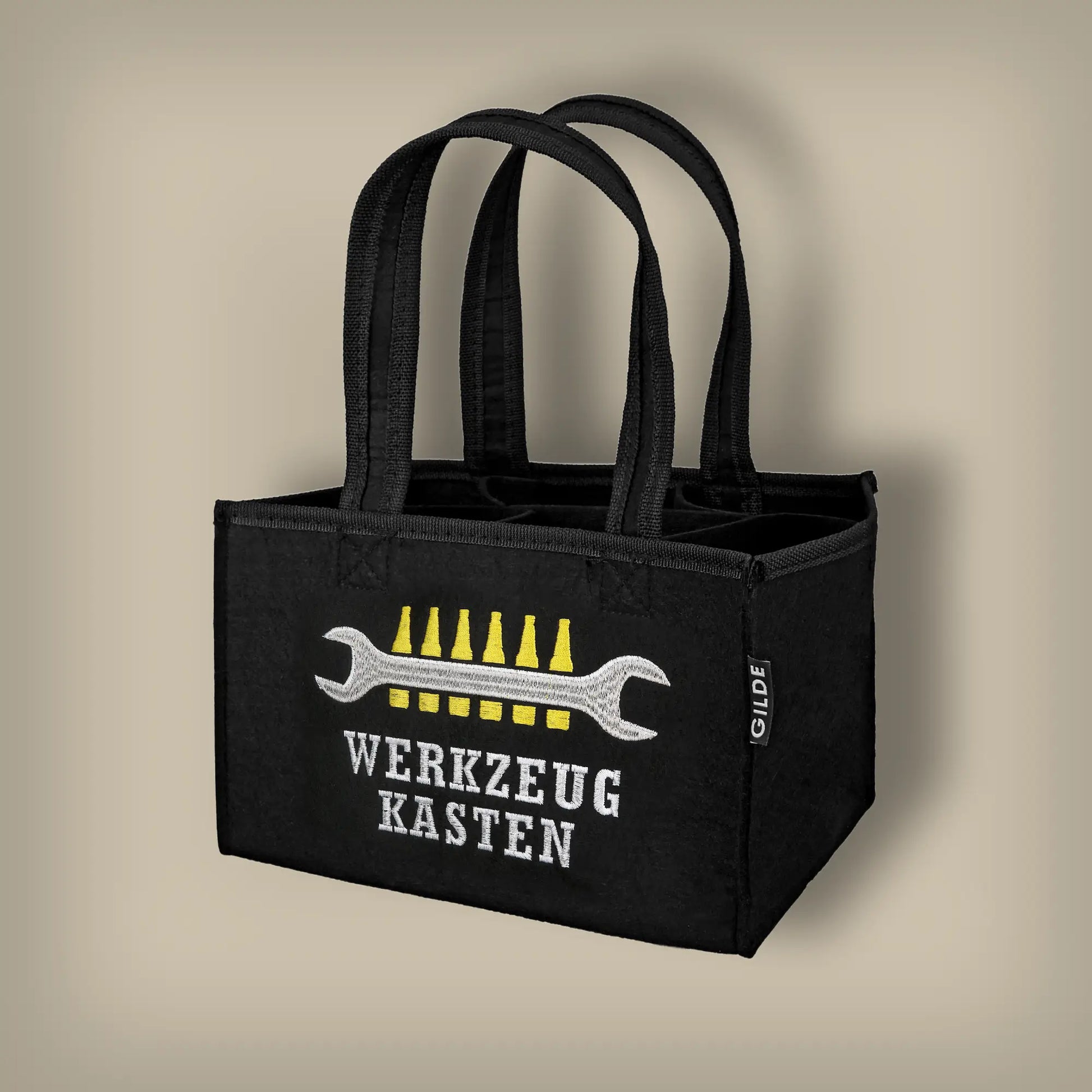 Diese stylischen Bieraccessoires aus schwarzem Filz sind das perfekte Geschenk für Bierliebhaber. 'Happy Biersday' und 'Werkzeug Kasten' bieten mit einer Höhe von 15 cm (inkl. Griff 32 cm) Platz für Flaschen und sorgen für einen originellen Look auf jeder Feier.