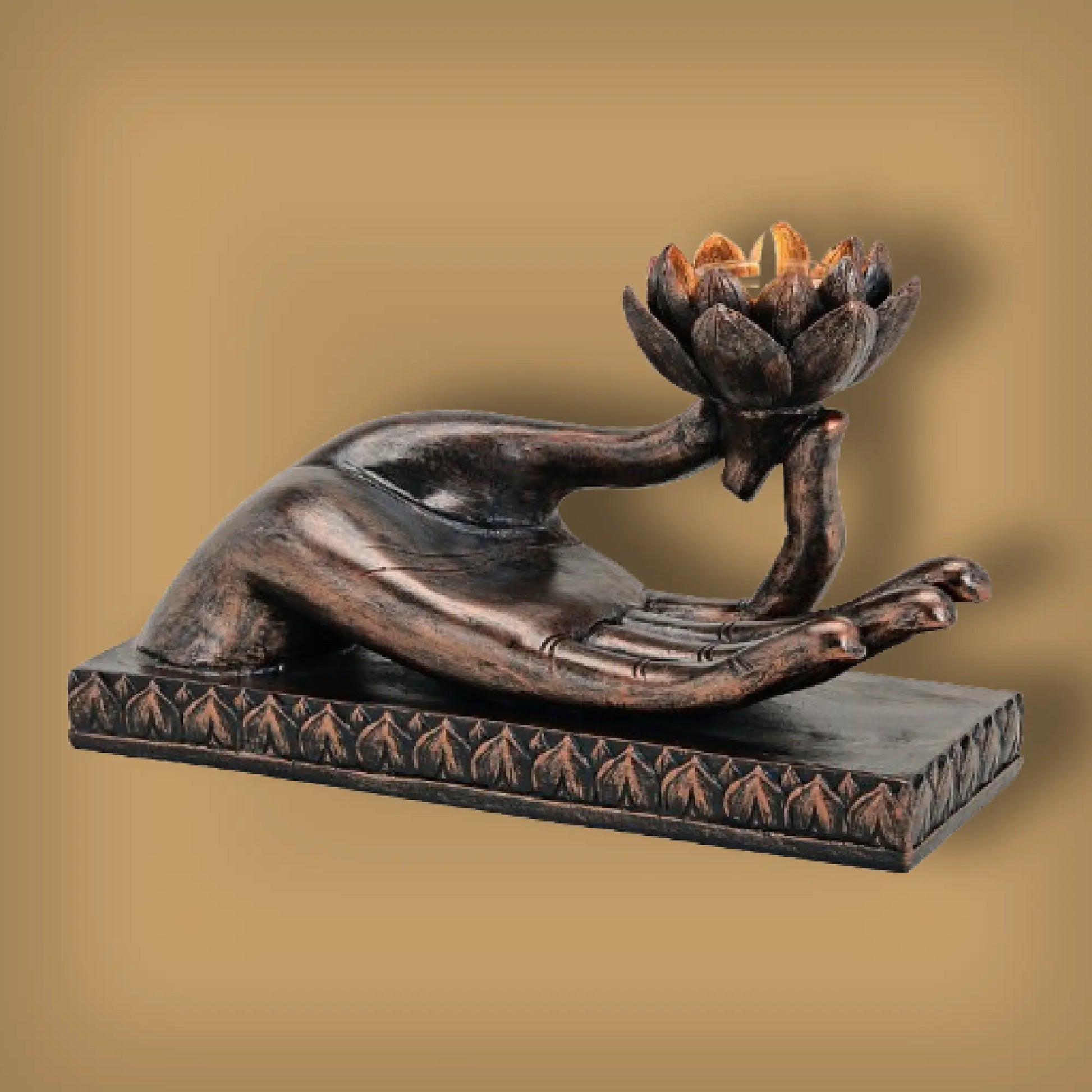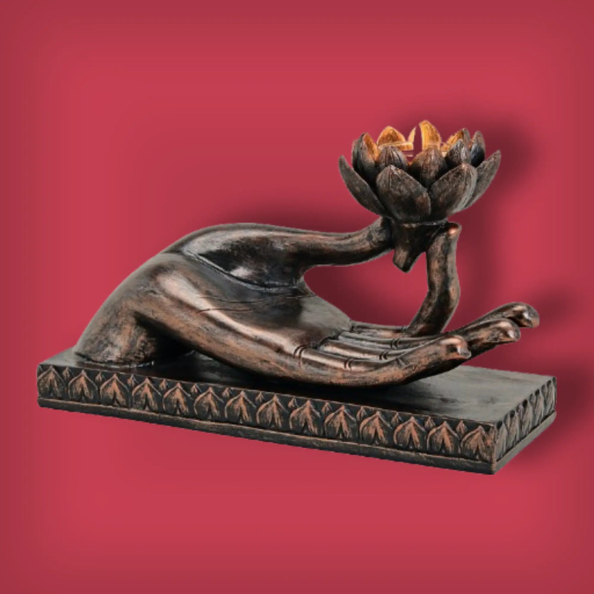 Stilvolle Buddha-Hand mit integriertem Teelichthalter aus Poly in edlem Braunton. Verleiht jedem Raum eine harmonische und spirituelle Atmosphäre. Maße: B 15 cm, H 19 cm, T 32 cm.
