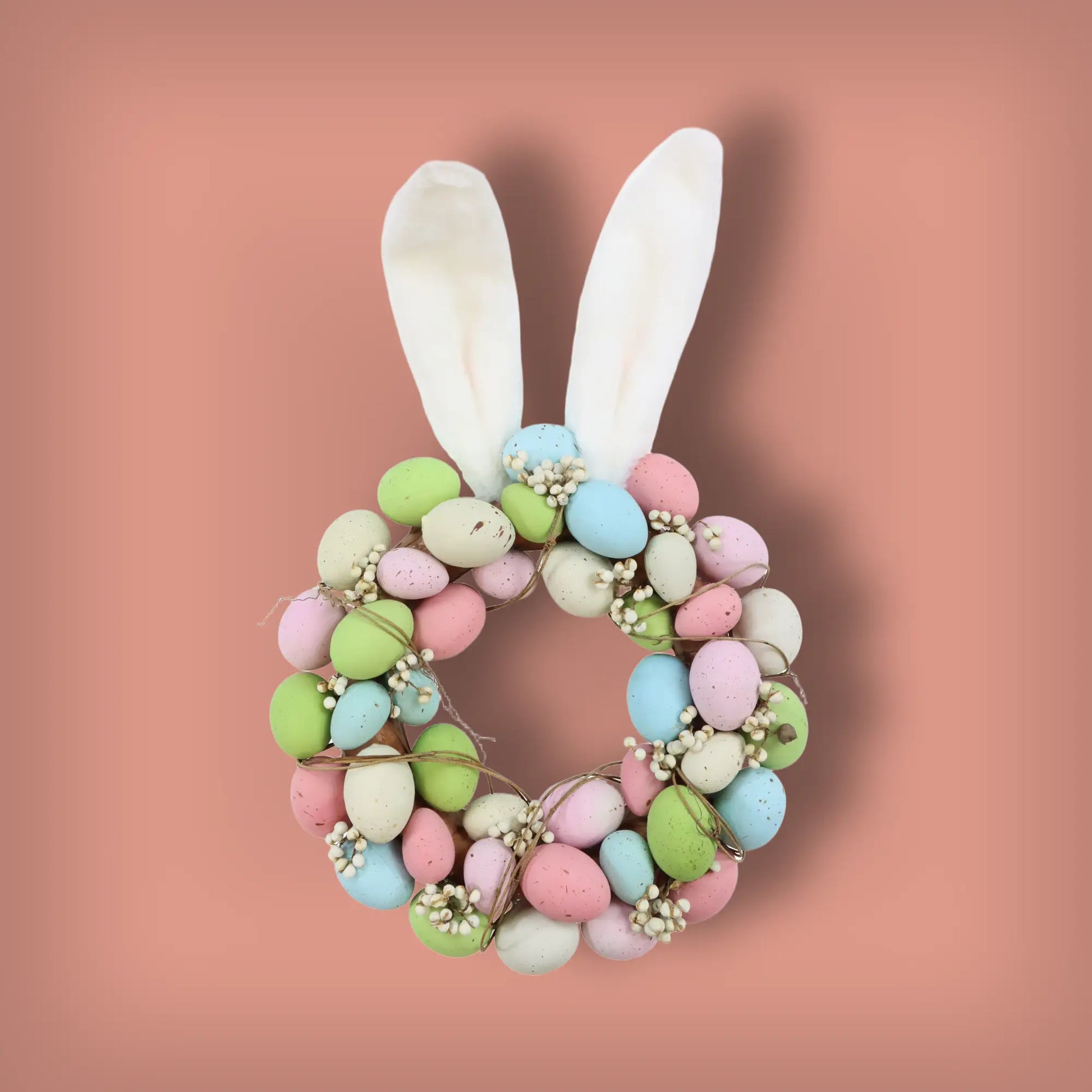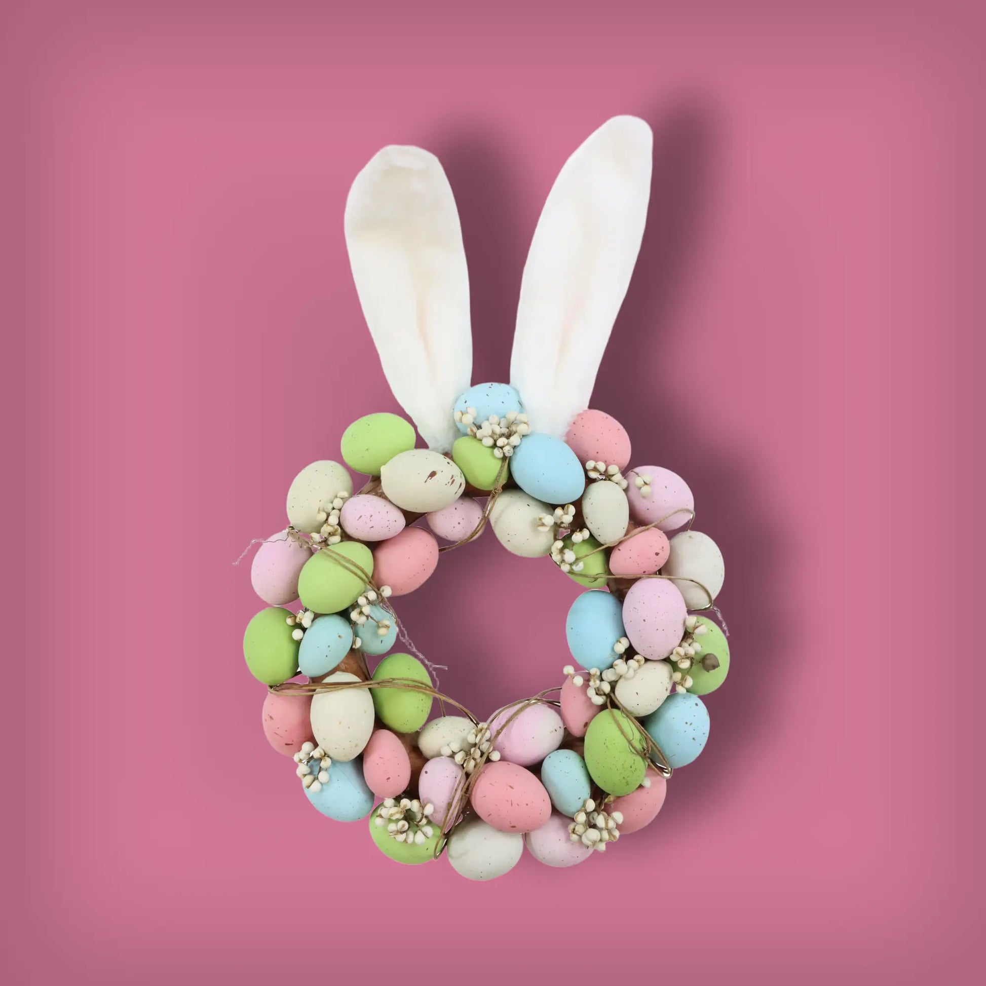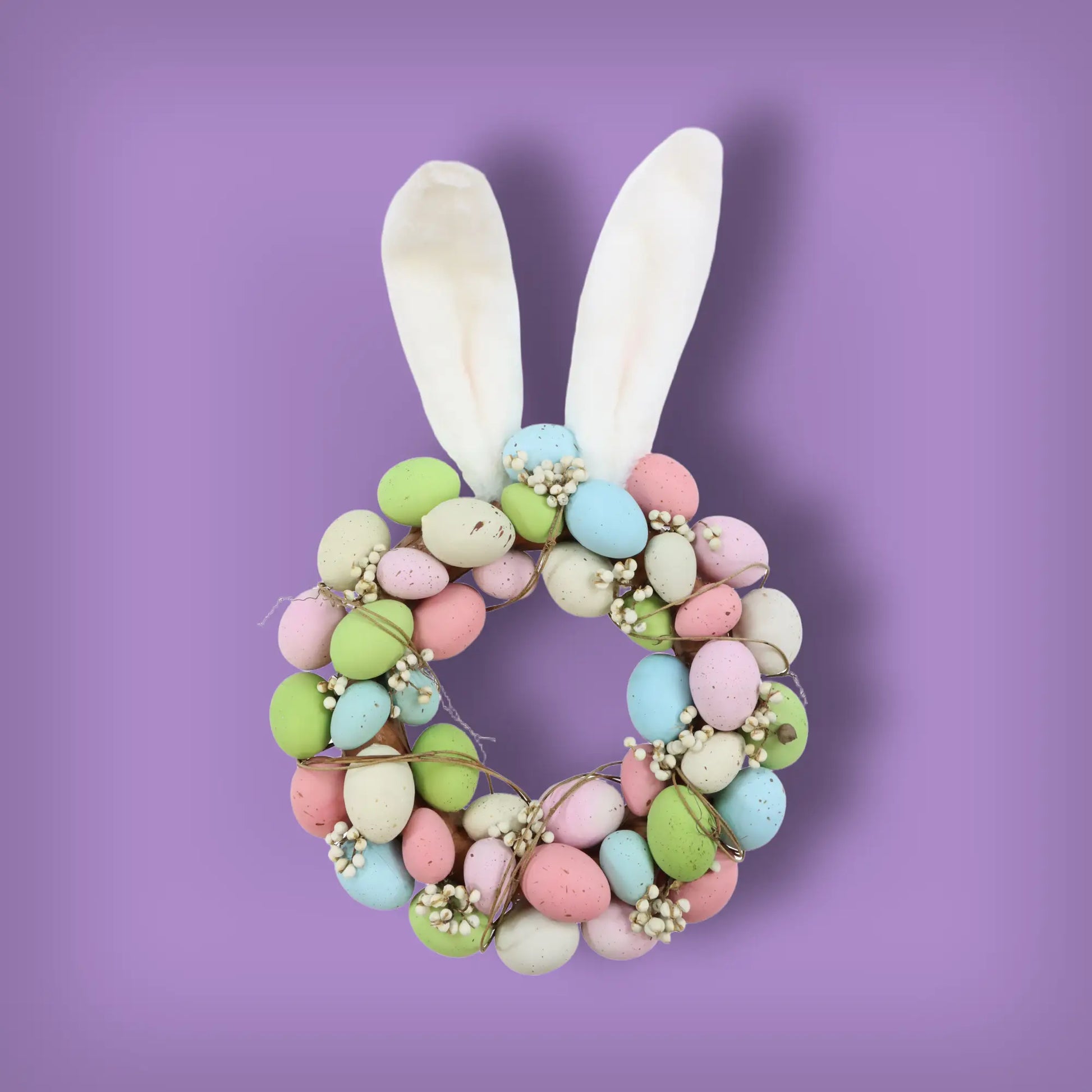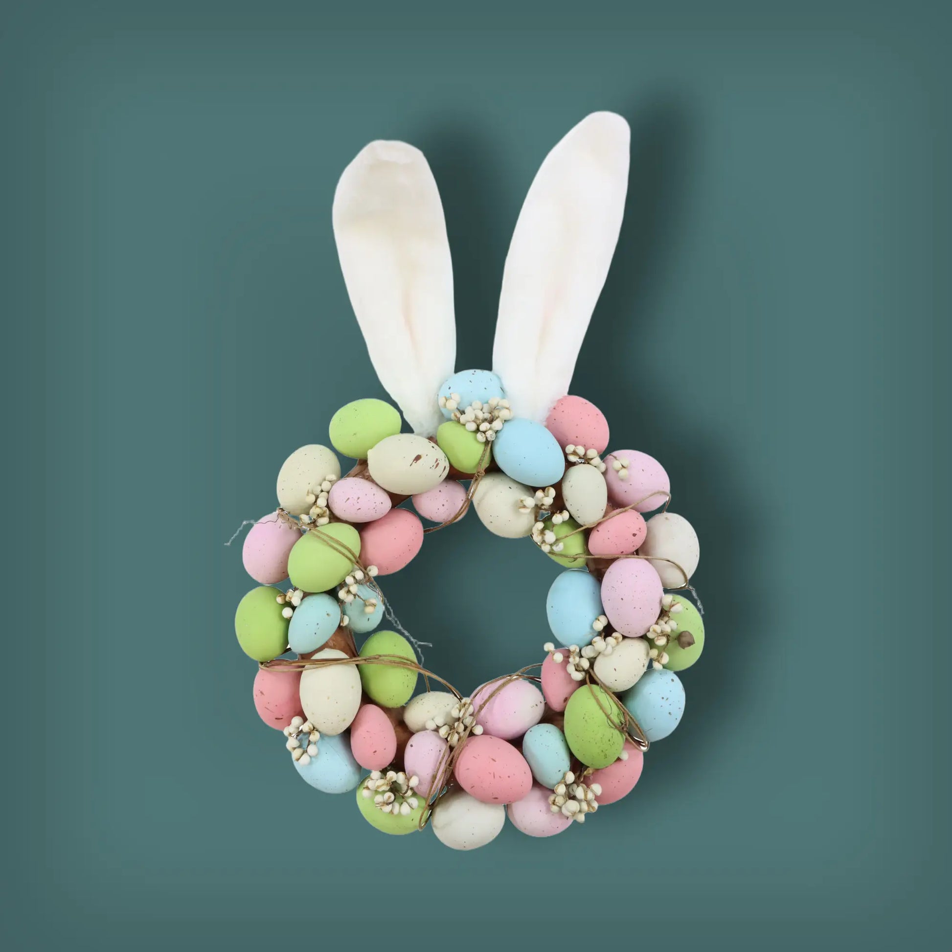 Ein dekorativer Eierkranz im Langohr-Design, kunstvoll aus Styropor, Plastik und Polyester gefertigt. Mit seinen Maßen von 30 x 46 x 6 cm bringt er charmante Frische in jede Dekoration und ist perfekt für den Frühling.