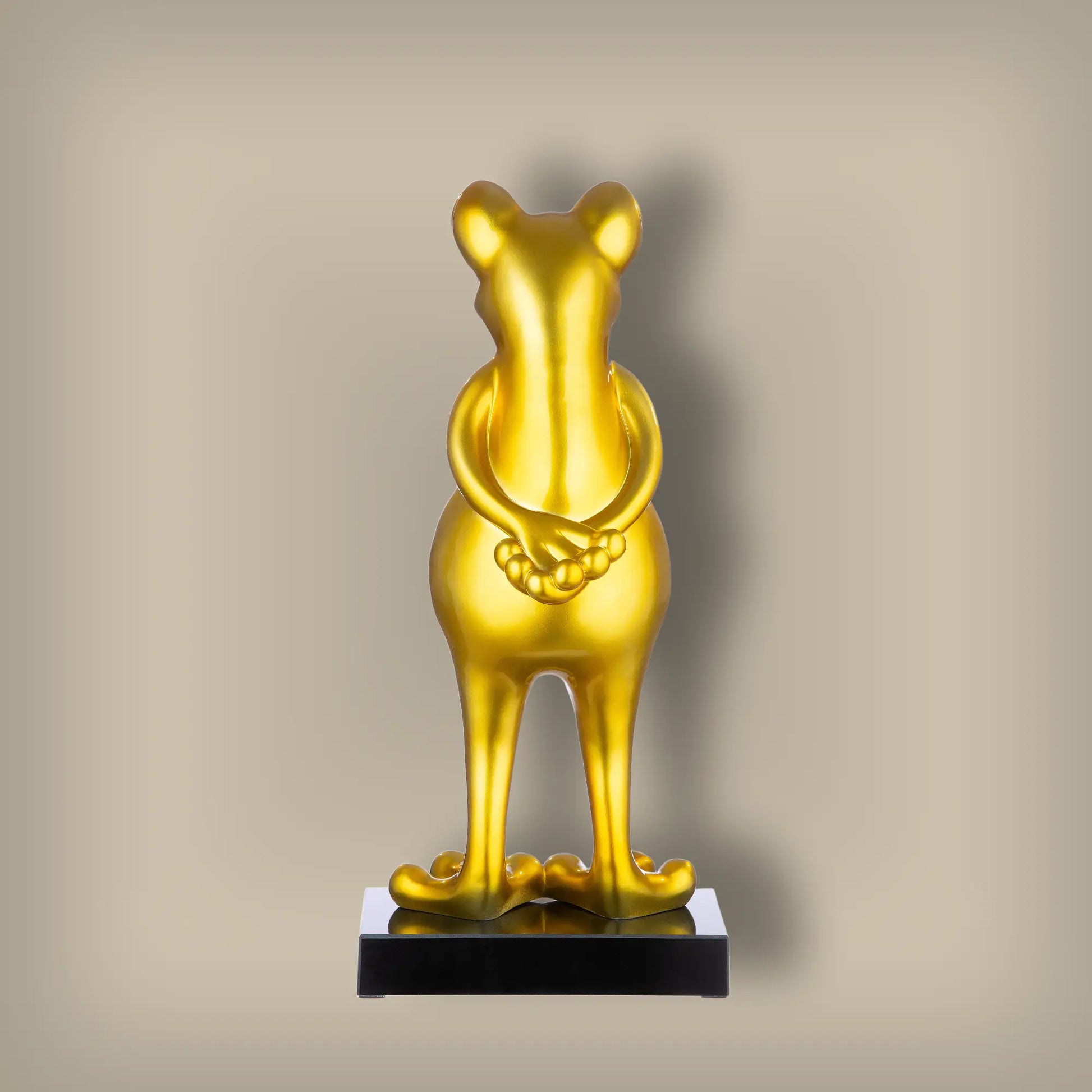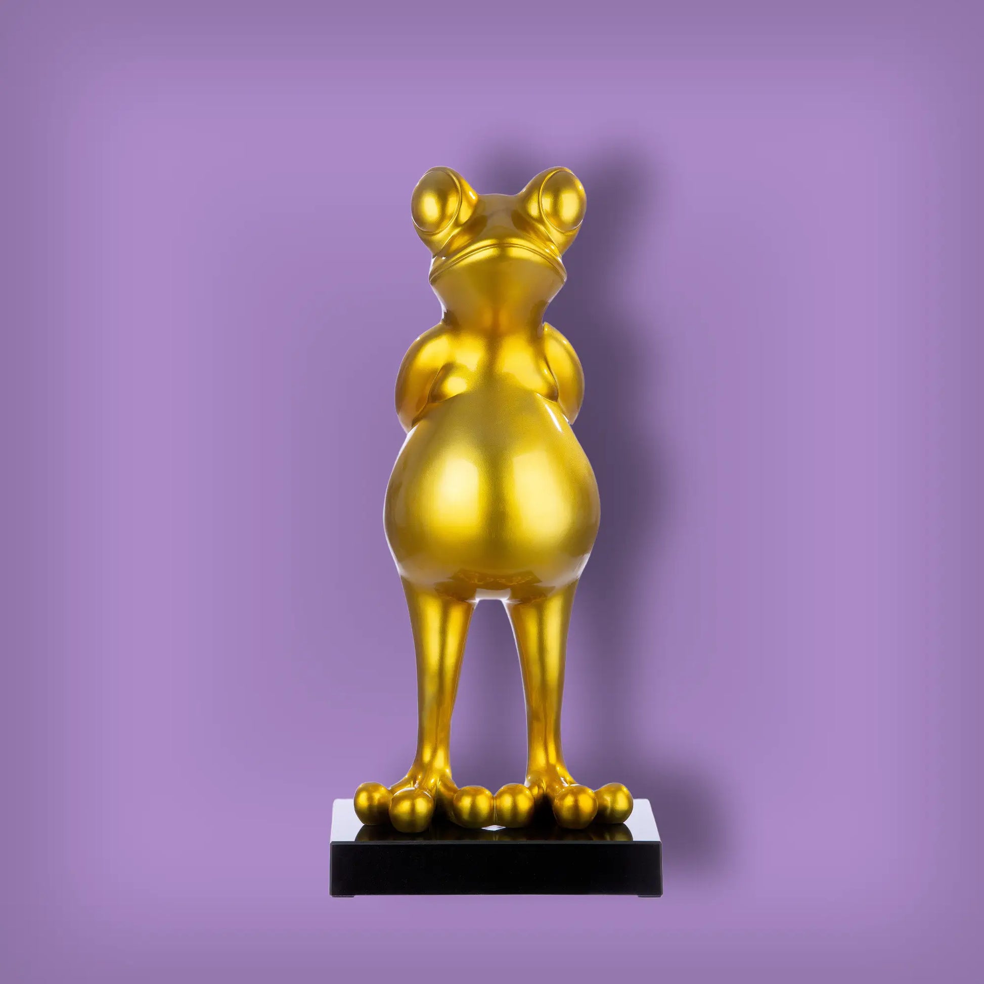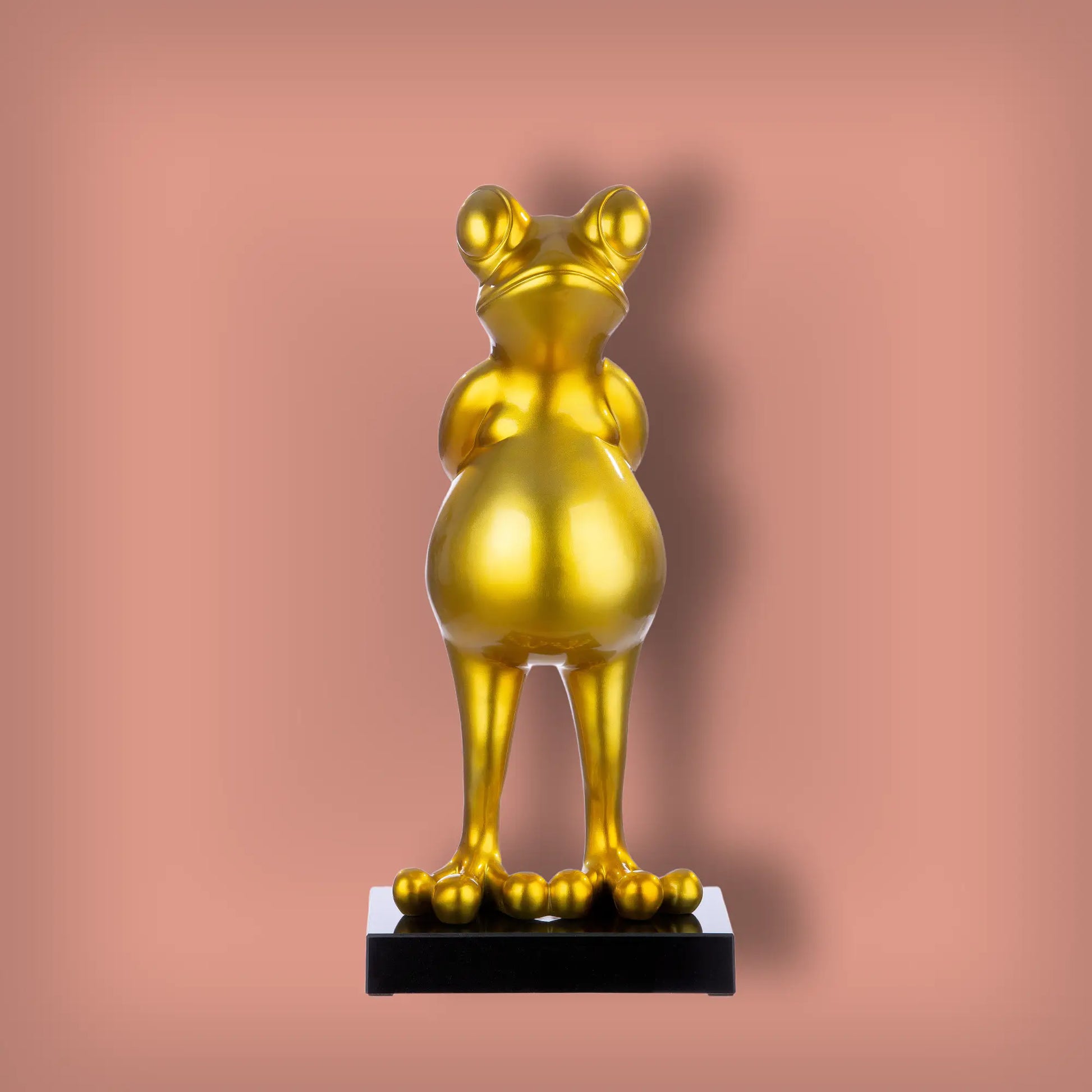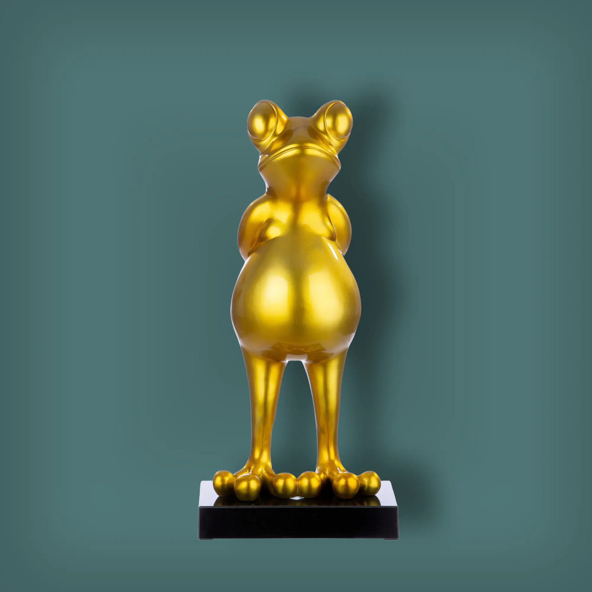 Diese beeindruckende, goldfarbene Frosch-Skulptur aus Kunstharz setzt elegante Akzente in jedem Raum. Mit einer Höhe von 68 cm ist sie ein stilvoller Blickfang für moderne und klassische Einrichtungen.