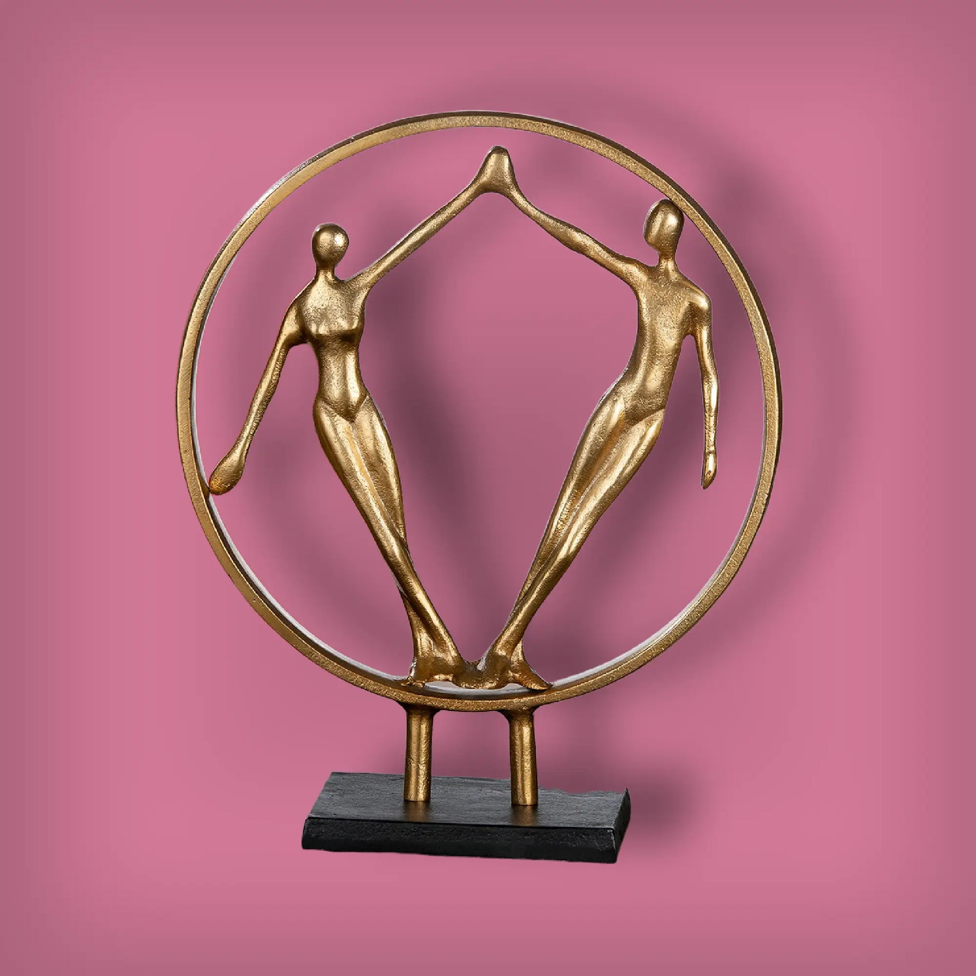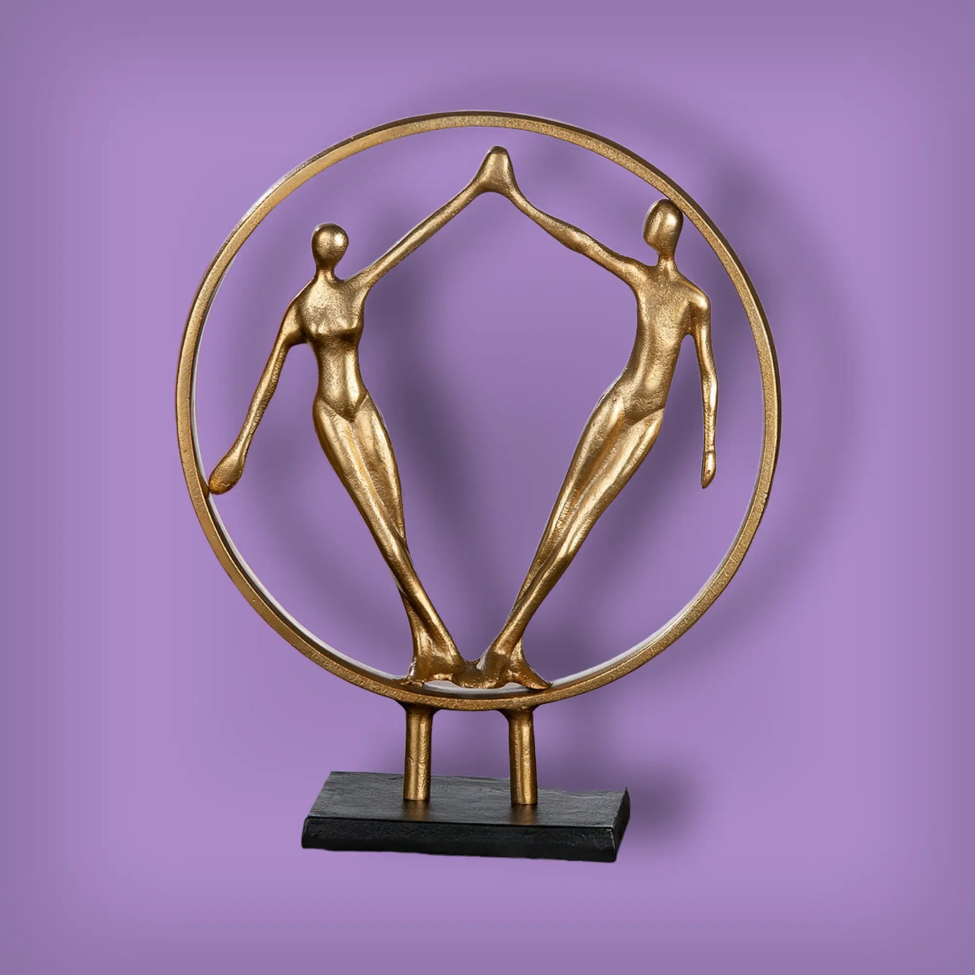 Runde Skulptur aus goldfarbenem Aluminium mit stilisiertem Paarmotiv. Ein eleganter Blickfang für Wohnräume oder Büros. Maße: L 11 cm, B 33,5 cm, H 41 cm.