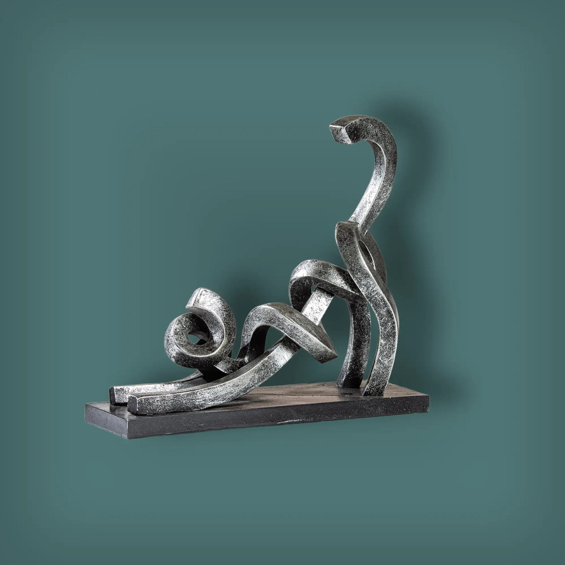 Elegante Katzen-Skulptur aus silberfarbenem Kunstharz, die durch ihre geschwungene Stretching-Pose besticht. Ein stilvolles Dekoelement für Wohnzimmer, Büro oder Regal, das zugleich Leichtigkeit und Eleganz ausstrahlt. Maße: L 10 cm, B 31,5 cm, H 29 cm.