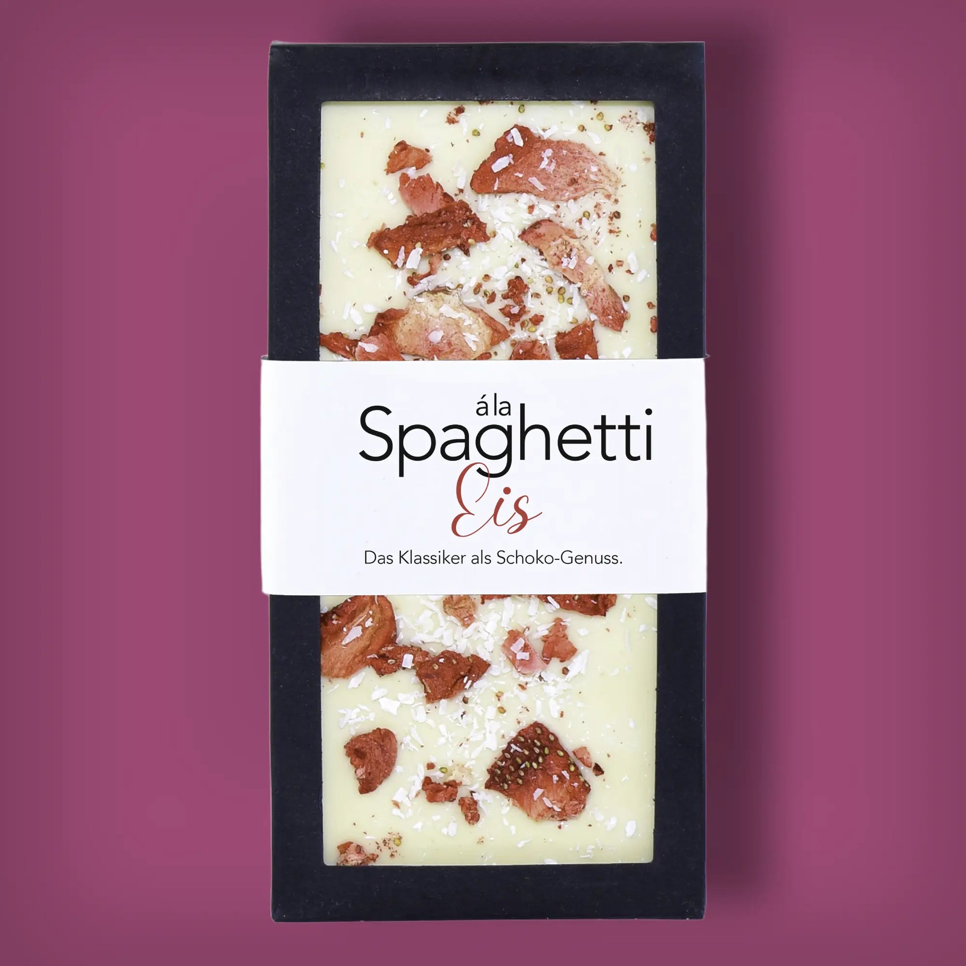 Willkommen in unserer süßen Genusswelt – mit der handgefertigten „Spaghettieis Schokolade“ holst du dir den beliebten Sommerklassiker in einzigartiger Schokoladenform nach Hause! Zart schmelzende Schokolade trifft auf feine Vanille- und Erdbeeraromen und wird von einer Schicht Kokosraspeln vollendet – für den perfekten Spaghettieis-Look. Jede Tafel ist ein liebevoll gefertigtes Unikat, das nicht nur optisch, sondern auch geschmacklich begeistert. Ob zum Verschenken oder Selbstgenießen – diese Schokolade sorgt das ganze Jahr über für sommerliches Glück!