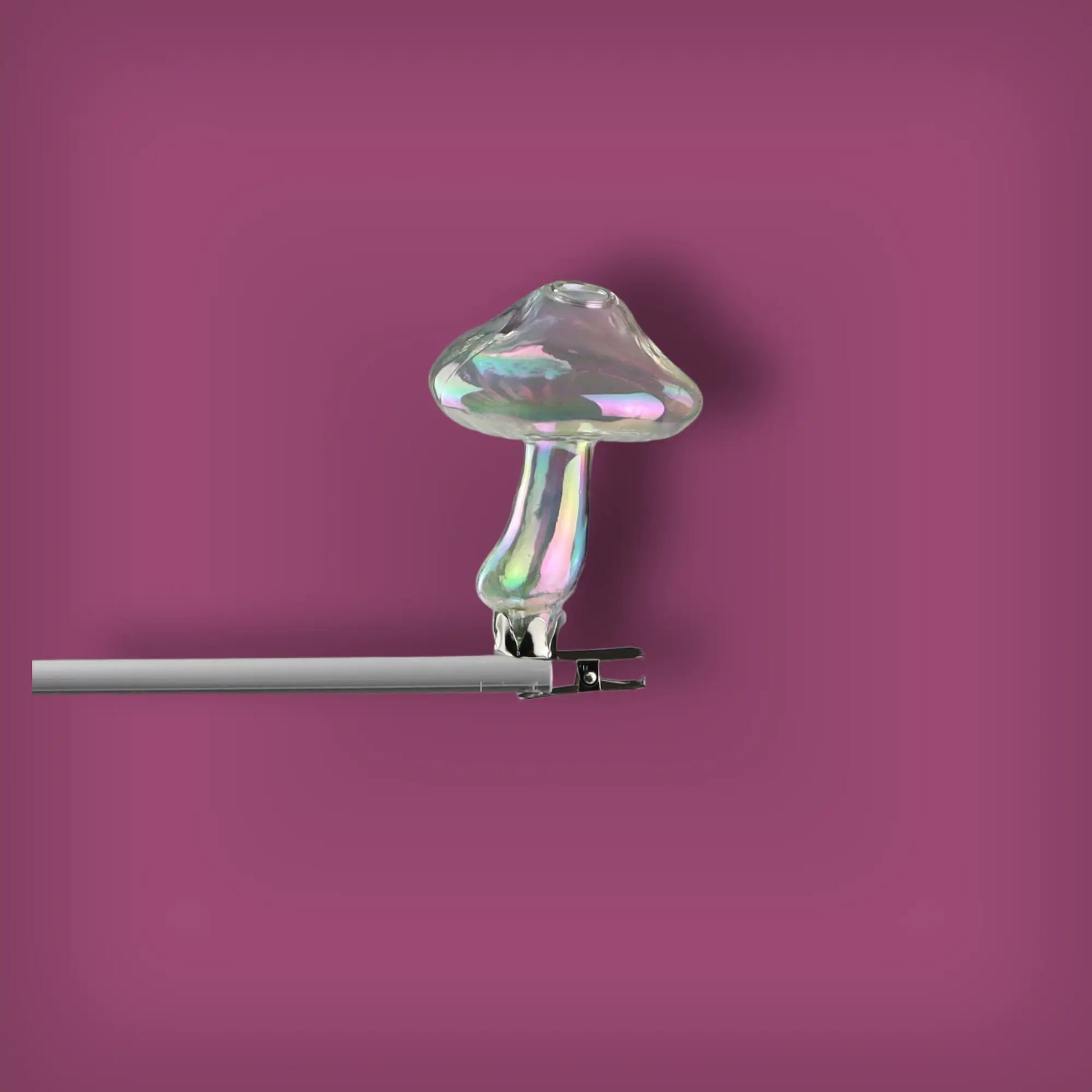 Zarte Glasvase in verspielter Pilzform mit schimmernd irisierendem Effekt und praktischem Clip. Ideal für einzelne Blüten, Gräser oder Trockenblumen. Das klare Glas mit sanftem Farbspiel fängt das Licht wunderschön ein und sorgt für elegante Akzente auf Tisch, Fensterbank oder im Regal. Klar Iris Glas 5×7 cm