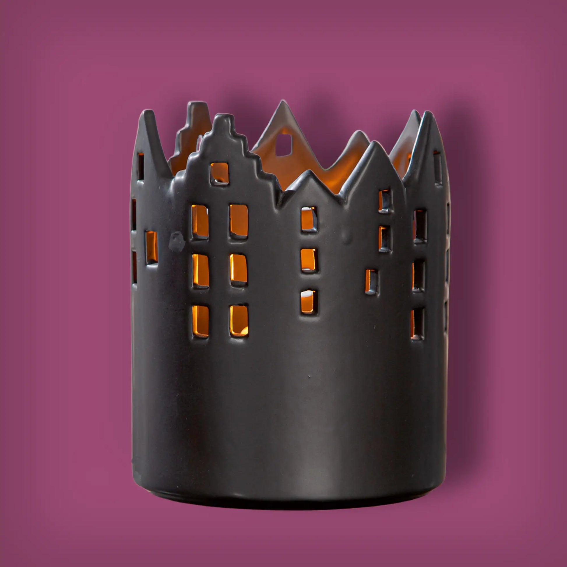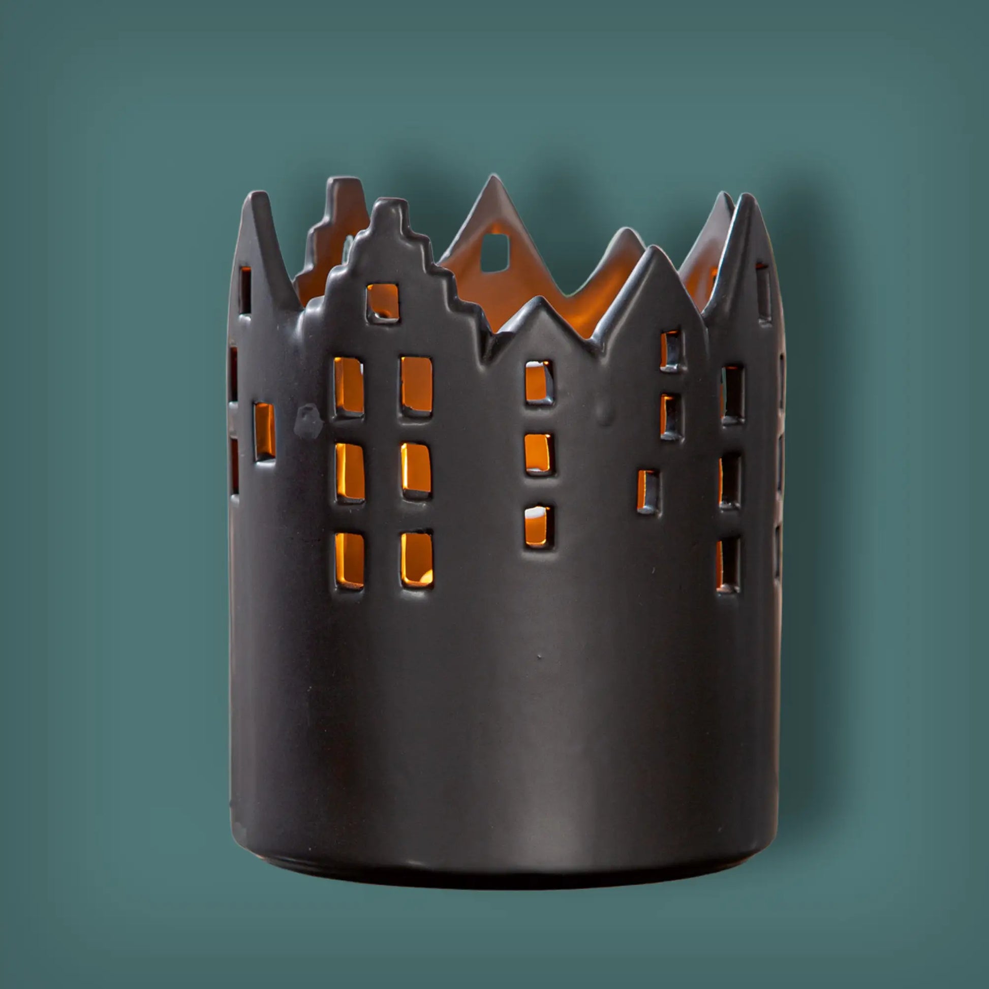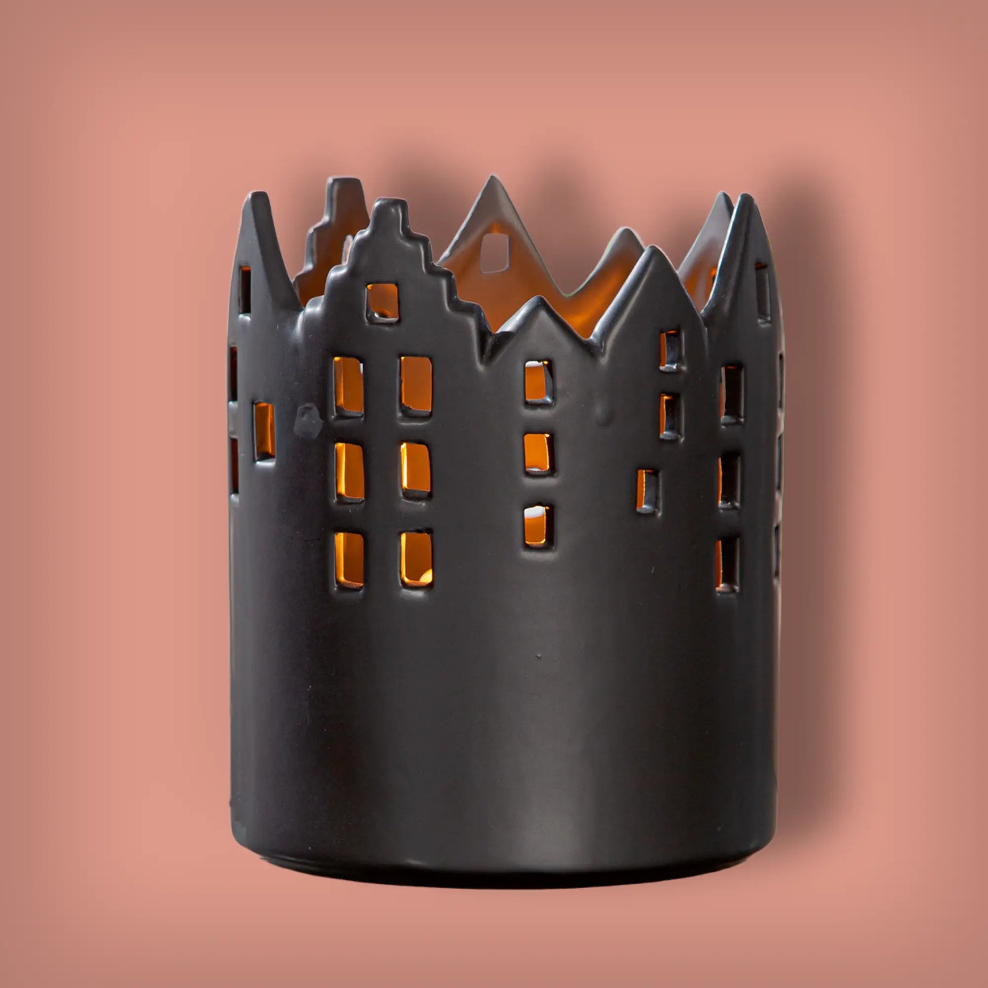Das Windlicht Castle bringt mit seinem eleganten Design aus hochwertiger Keramik einen Hauch von Luxus und Behaglichkeit in dein Zuhause. In edlem Schwarz gehalten, wirkt es zugleich modern und zeitlos – perfekt für stilvolle Wohnräume, elegante Tischdekorationen oder gemütliche Abende bei Kerzenschein.